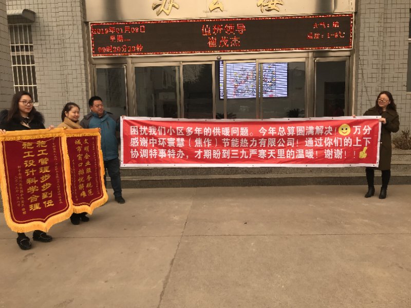 2019年1月8日上午,中環(huán)寰慧(焦作)公司經(jīng)營管理部、工程管理部收到了來自新華南街鳳凰家園全體居民送來的兩面錦旗——文明企業(yè)服務(wù)規(guī)范、城市窗口排憂解難;施工管理步步到位、施工設(shè)計(jì)科學(xué)合理,贊揚(yáng)熱力公司多方協(xié)調(diào),特事特辦,終于解決了困擾該小區(qū)多年的用暖問題,為小區(qū)居民排憂解難,送去嚴(yán)寒中的溫暖。該小區(qū)位于老城區(qū)新華南街,多年未供暖,小區(qū)居民對(duì)暖氣的渴望十分強(qiáng)烈,但是由于歷史原因,小區(qū)供暖設(shè)施建設(shè)遲遲不能完成。2018年,在熱力公司總經(jīng)理助理于文通、用戶發(fā)展中心主任張軍杰、工程管理部經(jīng)理張宗辰的多方努力下,終于圓滿完成了一次管網(wǎng)、換熱站的設(shè)施建設(shè),小區(qū)居民特送來錦旗以表達(dá)感激之情。