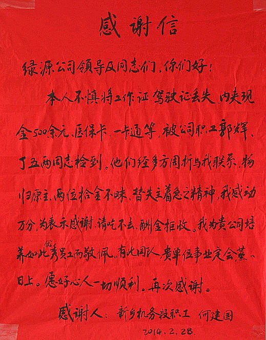 對(duì)于他們的這種拾金不昧的精神和品質(zhì),深深的感動(dòng)了失主。為此,失主親自給公司送來了感謝信,張貼在公司的辦公樓大廳內(nèi),并對(duì)公司教育和培養(yǎng)出的優(yōu)秀員工表示由衷的敬佩。