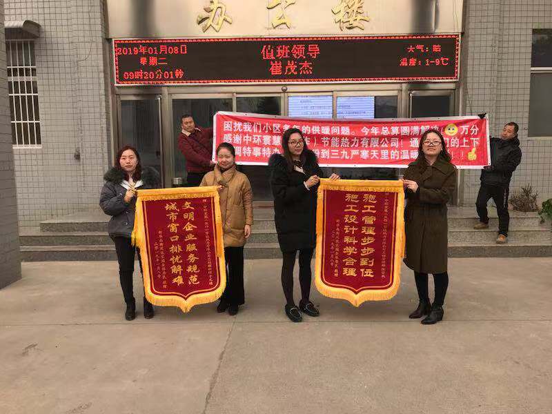 2019年1月8日上午,中環(huán)寰慧(焦作)公司經(jīng)營管理部、工程管理部收到了來自新華南街鳳凰家園全體居民送來的兩面錦旗——文明企業(yè)服務(wù)規(guī)范、城市窗口排憂解難;施工管理步步到位、施工設(shè)計(jì)科學(xué)合理,贊揚(yáng)熱力公司多方協(xié)調(diào),特事特辦,終于解決了困擾該小區(qū)多年的用暖問題,為小區(qū)居民排憂解難,送去嚴(yán)寒中的溫暖。該小區(qū)位于老城區(qū)新華南街,多年未供暖,小區(qū)居民對(duì)暖氣的渴望十分強(qiáng)烈,但是由于歷史原因,小區(qū)供暖設(shè)施建設(shè)遲遲不能完成。2018年,在熱力公司總經(jīng)理助理于文通、用戶發(fā)展中心主任張軍杰、工程管理部經(jīng)理張宗辰的多方努力下,終于圓滿完成了一次管網(wǎng)、換熱站的設(shè)施建設(shè),小區(qū)居民特送來錦旗以表達(dá)感激之情。