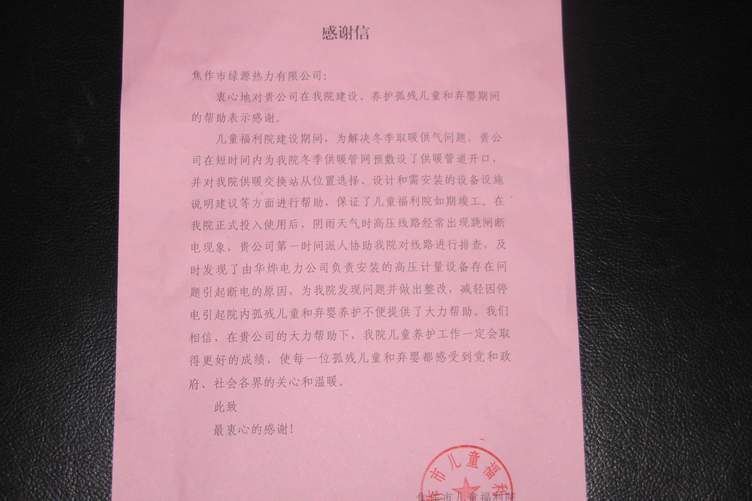 2010年7月19日上午,焦作市兒童福利院李院長帶隊(duì)一行4人來到綠源熱力公司,對綠源公司在兒童福利院建設(shè)、養(yǎng)護(hù)孤殘兒童和棄嬰期間的幫助表示感謝!