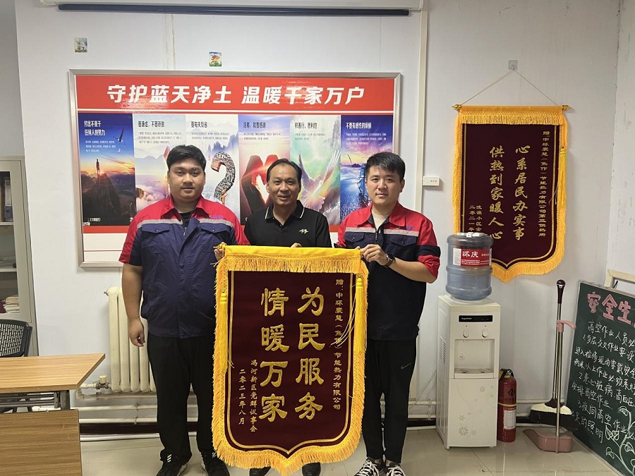目前該小區(qū)工程已接近尾聲,小區(qū)業(yè)主和社區(qū)代表頂著炎炎烈日將一面錦旗送到第三供熱所所長手中,感謝工作人員的辛勤付出,使小區(qū)145戶居民享受到集中供暖。